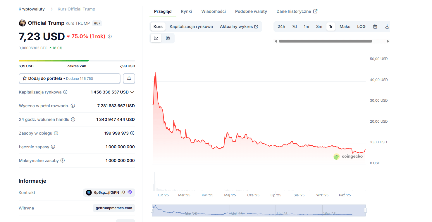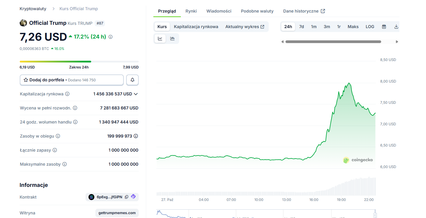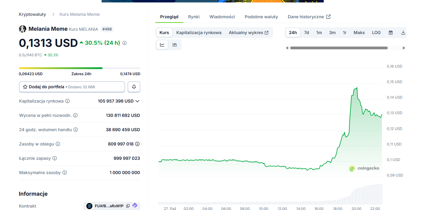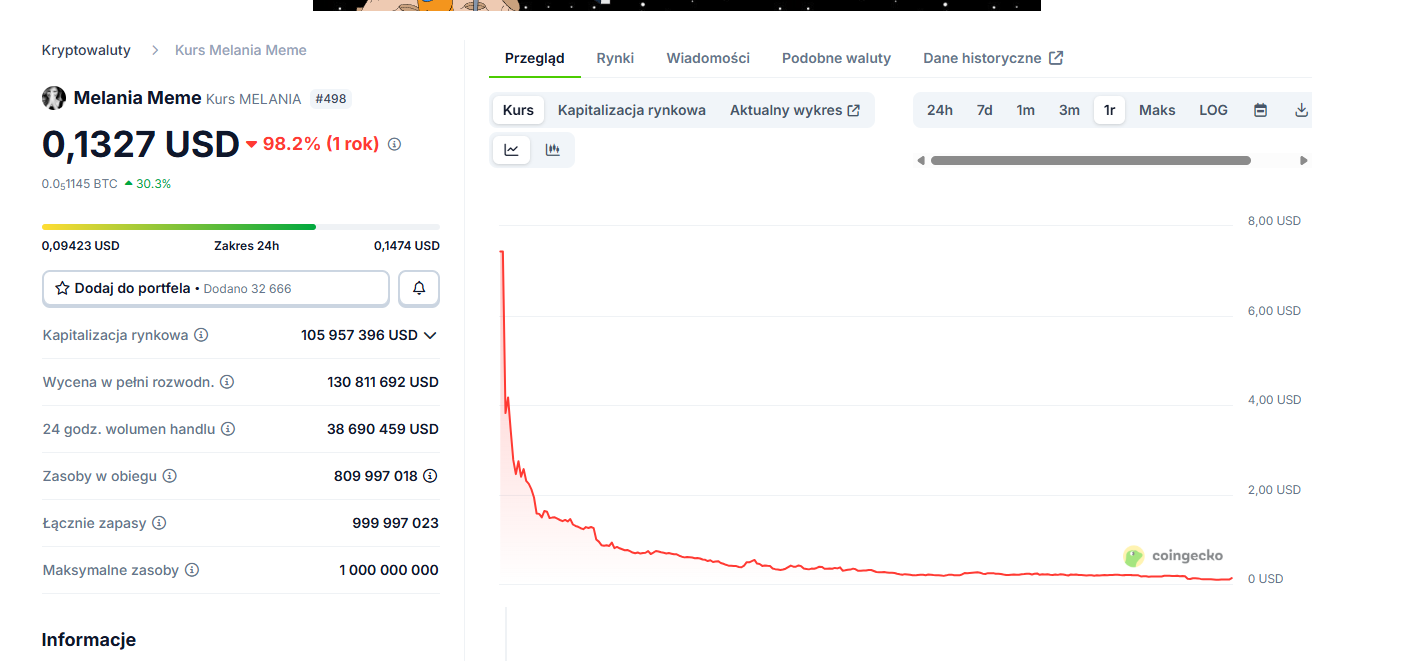 - Bardzo wysokie wolumeny handlu – $TRUMP z obrotem 1,34 mld USD, $MELANIA aż 38,7 mln USD w 24h