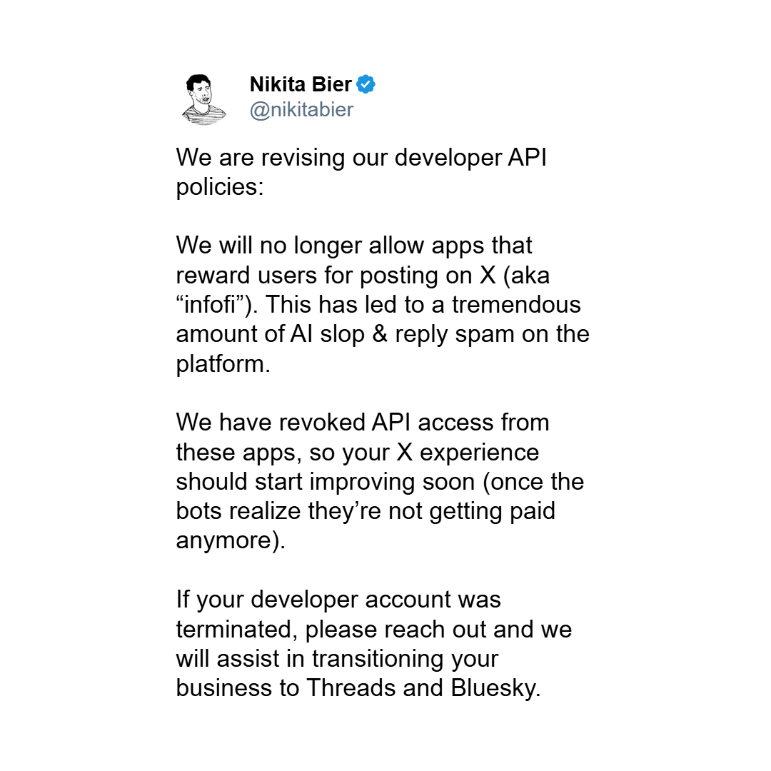 Zmiana w polityce X jest prosta – jak wyjaśnił Nikita Bier w swoim poście, platforma wycofuje dostęp do API dla wszystkich aplikacji, które promują „zarabianie na informacji” poprzez nagradzanie za posty. Dotychczas te projekty płaciły X miliony dolarów za zaawansowany dostęp do danych (Enterprise API), co było lukratywnym źródłem dochodu dla platformy. Teraz X mówi „nie” – nawet kosztem utraty tych milionów.