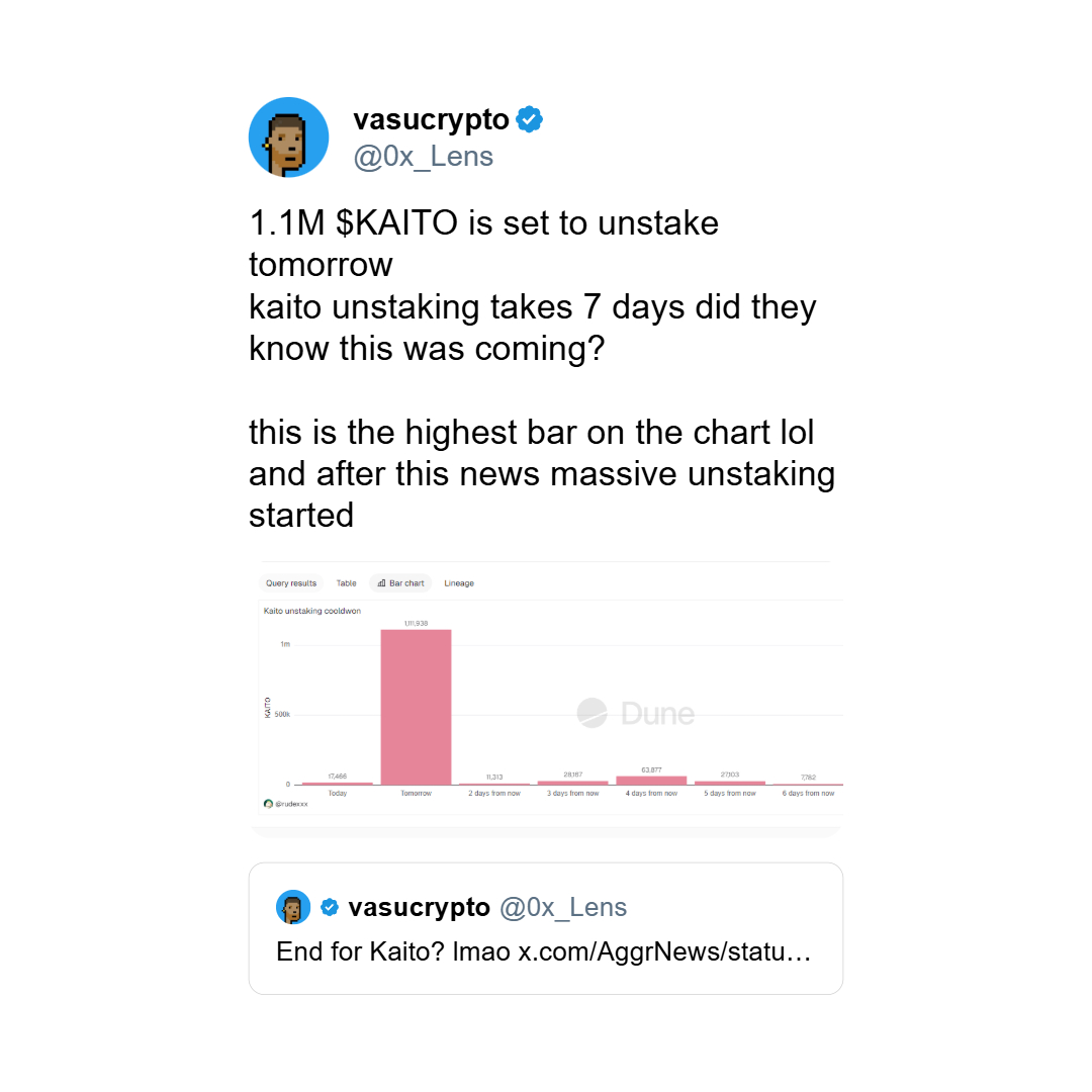 Ważna informacja dla posiadaczy kryptowaluty KAITO, jutro planowane jest uwolenienie ze stakowania – ponad 1,1 mln tokenów. Może to bardzo mocno wpłynąć na cene tej kryptowaluty.