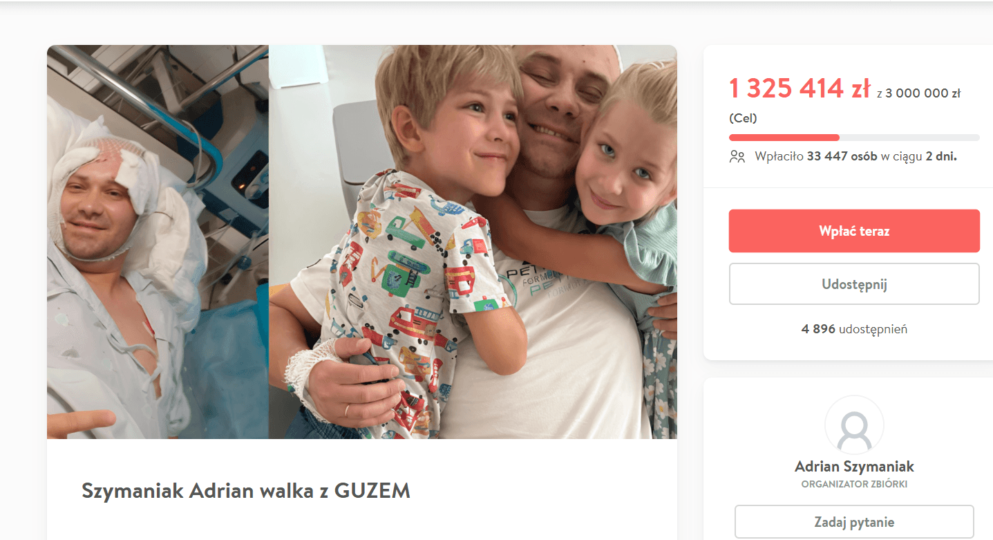 Po dwóch operacjach guz nadal wymaga intensywnej terapii. Leczenie ma kosztować aż 3 miliony złotych i obejmuje specjalistyczną terapię w Niemczech, która nie jest w pełni refundowana przez NFZ.