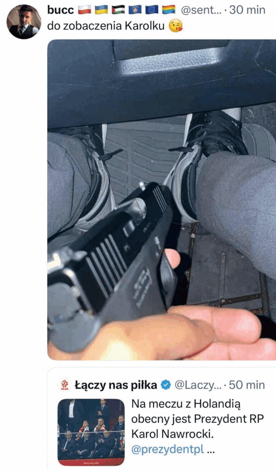 Wszystko zaczęło się od niewinnego wpisu oficjalnego konta Polskiego Związku Piłki Nożnej „Łączy nas piłka” (@LaczyNasPilka). Podczas meczu reprezentacji Polski z Holandią w ramach Ligi Narodów UEFA, konto poinformowało: „Na meczu z Holandią obecny jest Prezydent RP Karol Nawrocki. @prezydentpl”. Wpis szybko zyskał popularność, ale nie z powodu sportowych emocji. Pod nim pojawił się komentarz użytkownika o nicku „bucc” (@sent…), ozdobiony flagami Polski, Rosji, Palestyny, Unii Europejskiej i tęczową flagą LGBTQ+. Treść: „do zobaczenia Karolku 😘”, a do tego załączone zdjęcie pistoletu wycelowanego w czyjeś nogi w samochodzie.