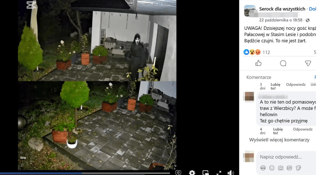 Ostatnie dni w Serocku przyniosły niepokój mieszkańcom jednorodzinnych osiedli – nocą po ulicach krąży zamaskowana postać w czarnej pelerynie. Jej biała maska przypomina przebranie z kultowego horroru „Krzyk”. Według relacji lokatorów intruz zagląda w okna, czasami świecąc latarką.