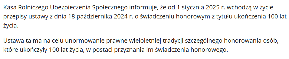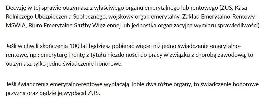 - Jeśli osoba ukończyła sto lat i pobierała emeryturę lub rentę z ZUS, świadczenie honorowe wypłaca ZUS.