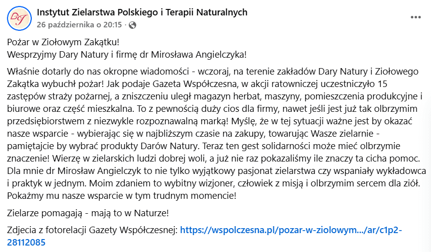 Właściciel firmy nie organizuje żadnej zbiórki pieniędzy, lecz prosi o inny rodzaj wsparcia. Zachęca, by pomagać, kupując produkty marki Dary Natury w sklepach internetowych i stacjonarnych. To gest, który pozwoli przedsiębiorstwu stanąć na nogi bez utraty zaufania kontrahentów i klientów.