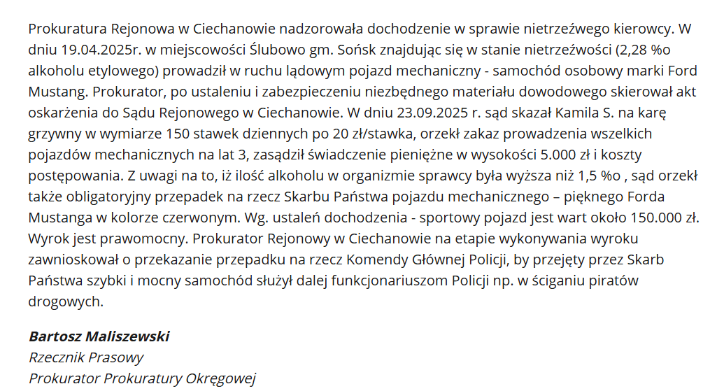 Od 14 marca 2024 r. obowiązuje zaostrzone prawo – samochody pijanych kierowców są bezwzględnie konfiskowane. Do sierpnia 2025 r. odebrano już ponad 11 tys. pojazdów, jednak przypadek Mustanga z Ciechanowa wzbudził szczególne zainteresowanie, bo auto nie trafi na aukcję, tylko do służby policyjnej. Zazwyczaj przejęte auta są licytowane, zyskując nowego właściciela za połowę rynkowej wartości. W leasingu lub wynajmie długoterminowym kierowca płaci równowartość pojazdu.