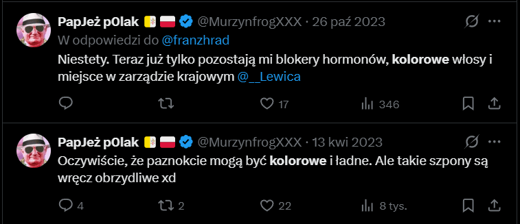 Początkowo konto miało charakter humorystyczny, jednak szybko ewoluowało w platformę do głoszenia skrajnie prawicowych, konserwatywnych poglądów. Właściciel konta zyskał popularność dzięki ostrym krytykom współczesnych trendów społecznych: atakował feminizm, ruch LGBTQ+, strajki kobiet, edukację seksualną w szkołach, rozwody, samotne macierzyństwo, p0lki i lewicowe idee. Posty były często prowokacyjne, pełne ironii i memów, co przyciągało zarówno zagorzałych zwolenników, jak i równie zagorzałych krytyków. W momencie pisania tego artykułu konto PapJeż p0lak znane również pod loginem MurzynfrogXXX obserwuje 115 tysięcy użytkowników portalu X. Mogłoby się wydawać, że to nie jest duża suma – jednakże jak na portal X to wystarczy by generować milionowe zasięgi – większe niż większość polityków i influencerów mogłoby marzyć.