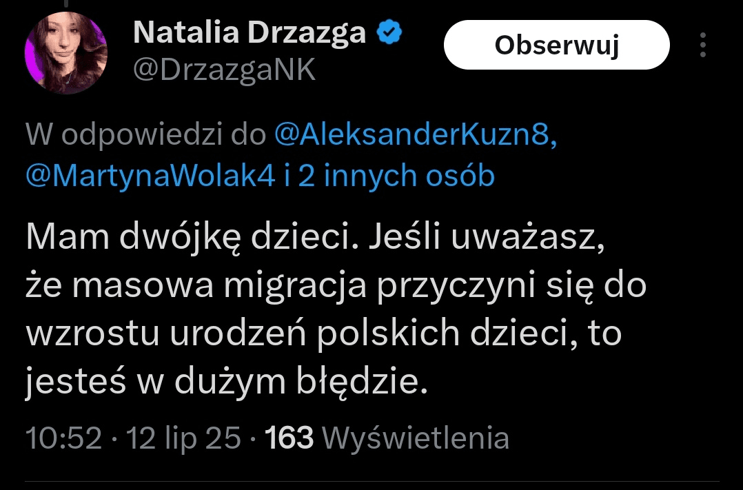 Internauci jednak nie byliby sobą, gdyby nie rozpoczęli natychmiastowej detektywistycznej pracy. Tatuaż stał się kluczem do zagadki – użytkownicy X zaczęli porównywać go z profilami różnych osób i szybko zidentyfikowali kobietę jako Natalię Drzazgę piszącą na X pod loginem DrzazgaNK. Okazało się, że jest to aktywna użytkowniczka platformy X, również znana z konserwatywnych poglądów. Za bardzo się nie kryła ze znajomością z Mikołajem – ponieważ sama oznaczyła go w zaplanowanym spotkaniu użytkowników X w Warszawie.