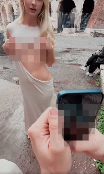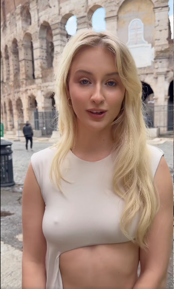Modelka decyduje się na publiczne obnażenie: pokazuje piersi na tle starożytnej areny, eksponując ciało w otoczeniu turystów i zabytkowych murów. To kolejny przykład jej stylu – mieszanki wakacyjnej swobody, ryzyka i promocji profilu na niebieskiej platformie.