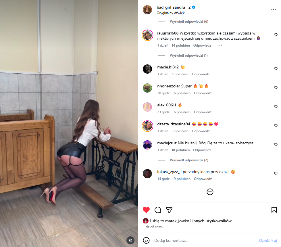 Jedni piszą wprost: prowokacja, brak szacunku, celowe igranie z uczuciami wierzących. „Nie bluźnij. Bóg Cię za to ukara- zobaczysz.”, „To już nie jest wolność, to chamstwo”, „Ksiądz powinien ją wyprosić” – to tylko najłagodniejsze komentarze spod tego wpisu. Dla wielu osób takie zachowanie to kolejny przykład, jak młodzi twórcy treści wykorzystują sacrum do budowania zasięgów.