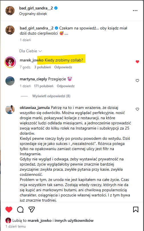 Sama Sandra na razie nie odniosła się szerzej do fali komentarzy. Nie wyjaśniła, czy naprawdę poszła się wyspowiadać, czy był to wyłącznie materiał na reelsa. Nie powiedziała też, czy spodziewała się takiej reakcji, czy może właśnie na nią liczyła.