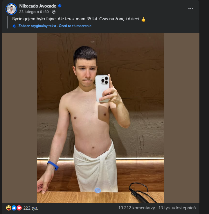 Kontrowersyjny amerykański youtuber Nikocado Avocado, znany przede wszystkim z spektakularnej metamorfozy ciała, znów wywołał prawdziwą burzę w Internecie. 23 lutego 2026 roku 35-letni Nicholas Perry opublikował na Facebooku selfie w lustrze – stoi w ręczniku owiniętym wokół bioder, z poważną miną i iPhonem w dłoni – a pod zdjęciem zamieścił szokujące oświadczenie: