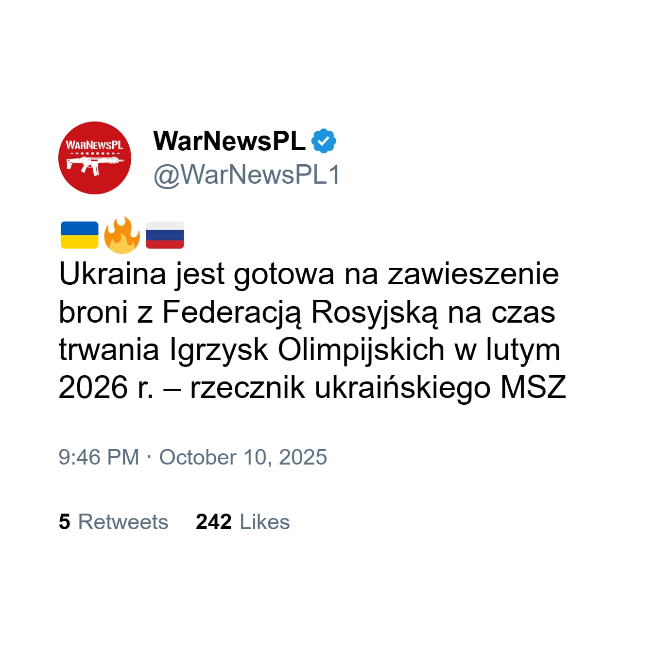 Według oficjalnego rzecznika ukraińskiego MSZ, Ukraina rozważa możliwość zawieszenia ognia w konflikcie z Rosją w czasie trwania Igrzysk Olimpijskich planowanych na luty 2026 r.